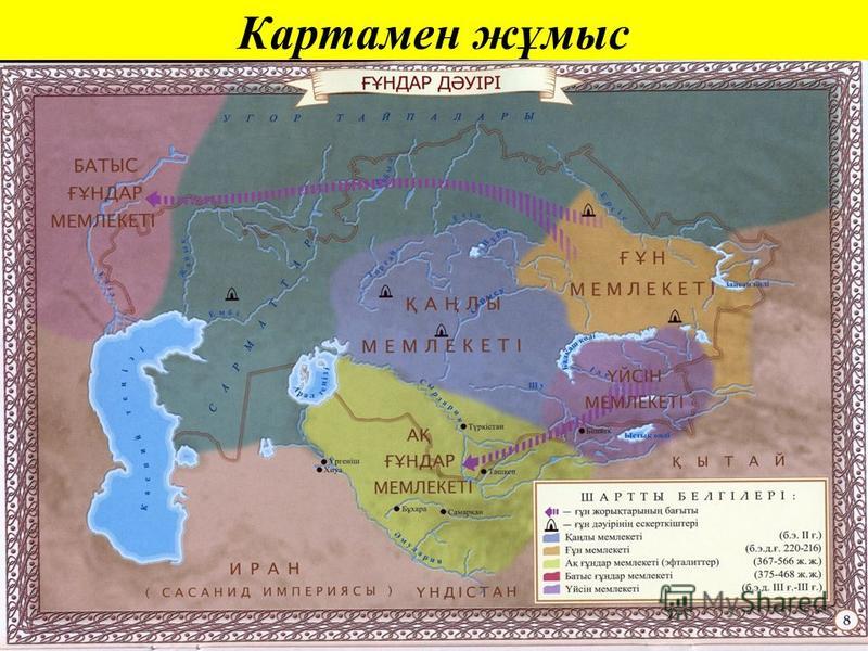 Б. 3-тапсырма «Ыстық орындық» әдісі. Әр топтан 1 баладан картаға шығады. Өтілген тақырыпты қорытындылау үшін оған ғұндар бойынша, олардың тайпалық одақтары жайында, көрші елдер туралы, т.б. сұрақтар қояды. Сыныптың қалған бөлігі бұл «кейіпкерге» кезектесіп сұрақ қояды, ал ол сол «кейіпкер» сияқты жауап беруі керек. Дескрипторлары: Картадан тайпалық одақтарды, ғұндардың орналасуын, көршілерін дұрыс атайды және көрсетеді.