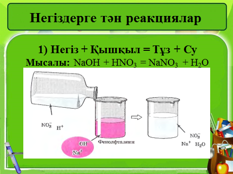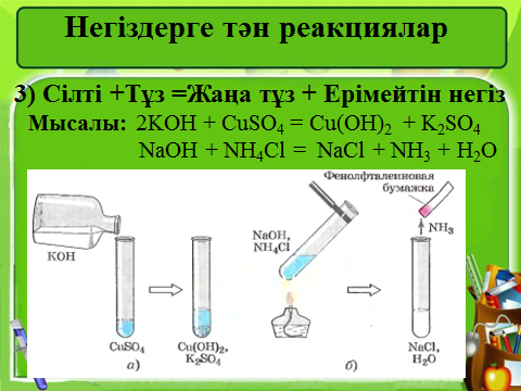 8.3.4.10 Негіздердің жіктелуі мен қасиеттерін білу және түсіну. Негіздердің химиялық қасиеттерін сипаттайтын реакция теңдеулерін құрастыру. |