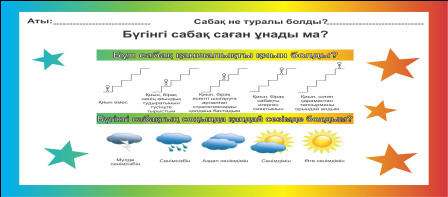 Сабақты қорыту. Жалпа сабақ бойынша «Бүгінгі сабақ саған ұнады ма?» әдісі арқылы оқушылардан кері байланыс аламын және сабақта бала қандай көңіл-күйде болғанын байқауға болады.