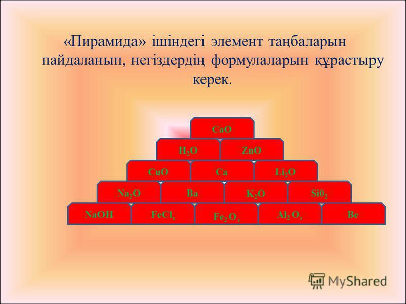 Осы тапсырма арқылы қарқыны жоғары оқушыны анықтап аламын және қосымша тапсырма беремін. «Пирамида» әдісі арқылы.Бұл әдісте негіздердің формуласын құрастырады.
