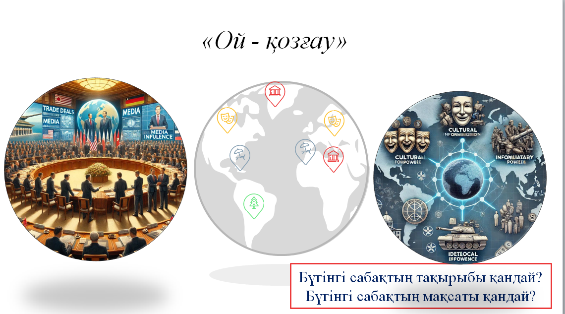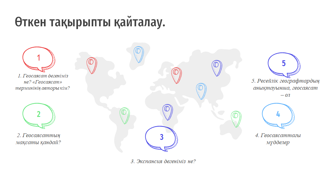 (Ұ) Ұйымдастыру кезеңі Оқушылармен амандасып, оқушылардың көңілін сабаққа аудару. Сыныпты түгелдеу, сыныптағы оқушылардың зейінін сабаққа аудару Өткен тақырыпты қайталау. Сұрақтарға жауап беру 1. Геосаясат дегеніміз не? Терминнің авторы кім? 2. Геосаясаттың мақсаты қандай? 3. Ресейлік географтардың анықтауынша, геосаясат – ол 4. Геосаясаттағы мүдделер 5. Экспансия дегеніміз не?