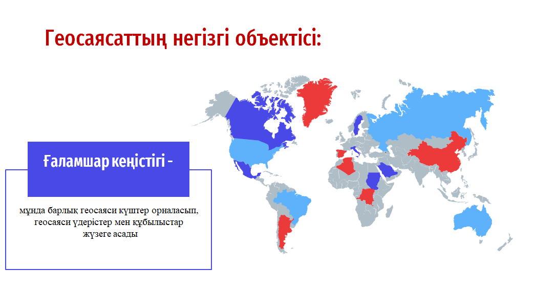 Геосаясат нысандары мен субъектілерінің мән мағынасын түсінеді. Елдерді мысалға келтіреді