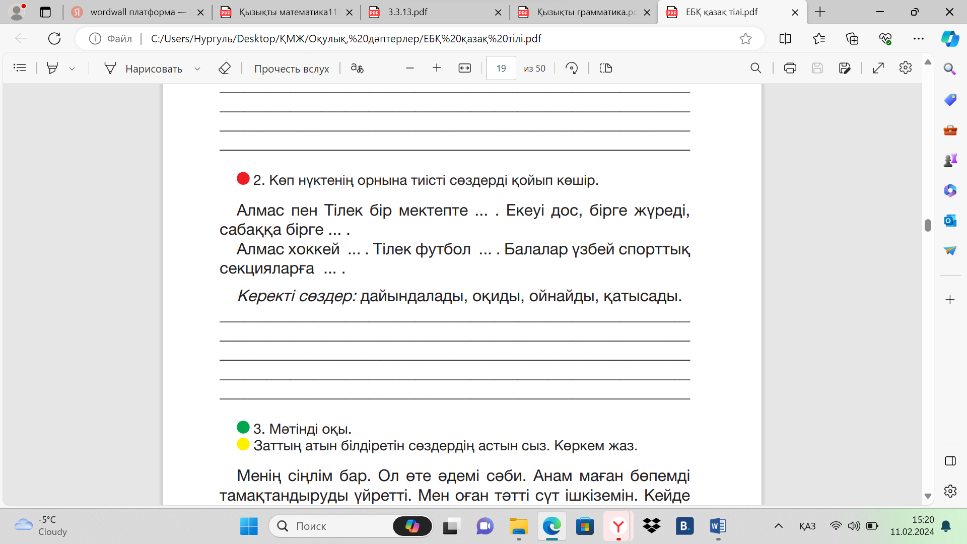 3.1.2.1* мәтіннің тақырыбы мен берілген суреттер, фото, диаграмма бойынша мәтіннің мазмұнын болжау 3.2.4.1 өз бетінше мәтіннің тақырыбын және мұғалімнің көмегімен негізгі ойды анықтау 3.3.5.1 жіберілген пунктуациялық, орфографиялық, грамматикалық және стилистикалық қателерді мұғалімнің көмегімен тауып, түзету 3.4.2.4* негізгі, туынды зат есім/сын есім/етістікті анықтау |
