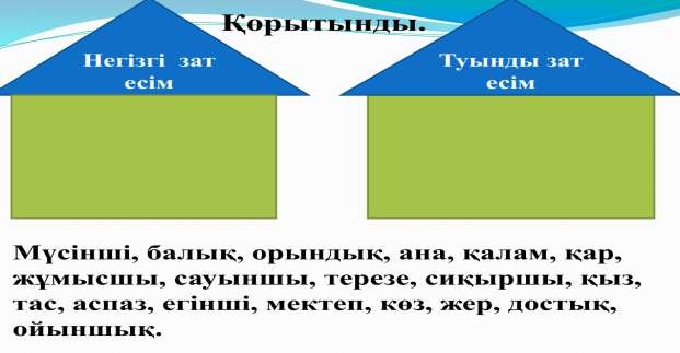 Дескриптор: -негізгі және туынды зат есімді біледі. -негізгі зат есімді табады. -туынды зат есімді табады. Негізгі және туынды зат есім сөздерін санырау құлақтан тауып айту.