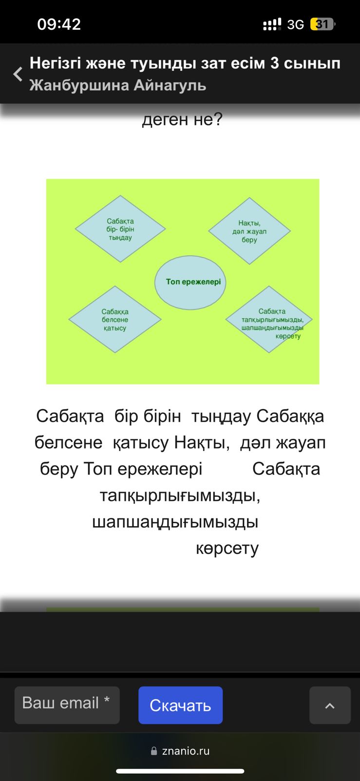 Оқушылар сабақтың тақырыбы мен мақсатымен танысады Үй тапсырмасын тексертеді(1б) Сұрақтарға жауап береді Топ ережесімен танысады. |
