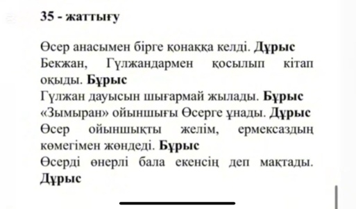 Мәтін мазмұны бойынша төмендегі ақпараттардың дұрыс –бұрыстығын анықтайды, мәтін кейіпкерлерінің әрекетіне өз көзқарастарын білдіреді.