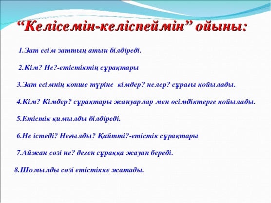 Негізгі және туынды зат есімнен келетін сөздерді ажыратады. Кейіпкерлер арқылы кері байланыс. |