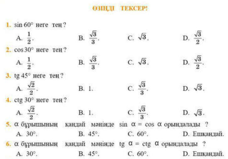 Синусты 600 мәнін табады; Косинустын 300 мәнін біледі Тангенстің 450 мәнін табады; |