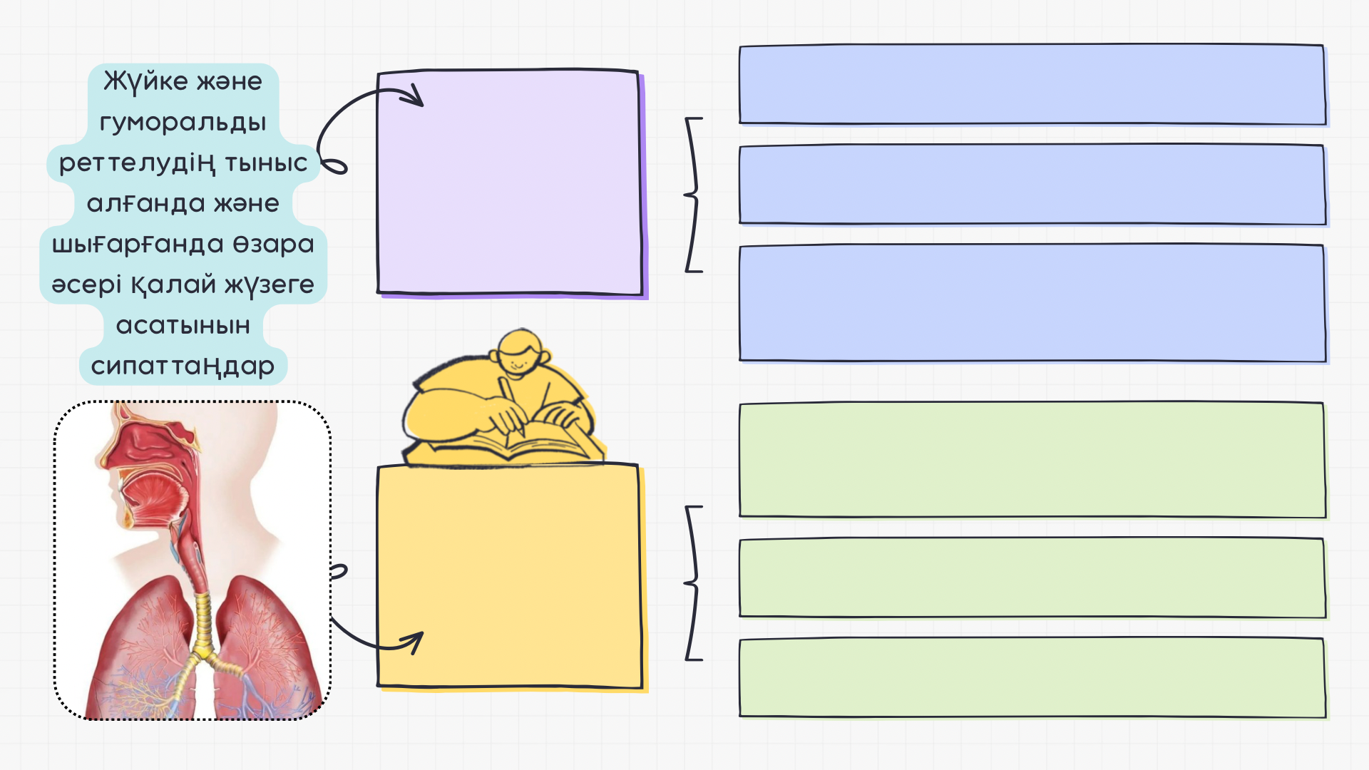 Дескрипторлар; Жүйкелік реттелудің ерекшелігін анықтайды; Гуморальды реттелудің ерекшелігін анықтайды; Ұқсастығын жазады. Дескрипторлар: Тыныс алу мысалында жүйке және гуморальды жүйелердің бірлесіп жұмыс істеу принципін сипаттайды; Жүйке және гуморальды жүйелердің әрекетін салыстырады; Олардың қандай жағдайда басым екенін түсіндіреді. Сергіту сәтіне қатысады Дескрипторлар: Тұжырымдардың дұрыс немесе бұрыстығын анықтайды. Дескрипторлар: Нейрогуморальді жүйелердің реакцияларын жазады; Бірлік пен ынтымақ ұғымдарының маңызын көрсетеді; Қорытынды тұжырымын жазады. |