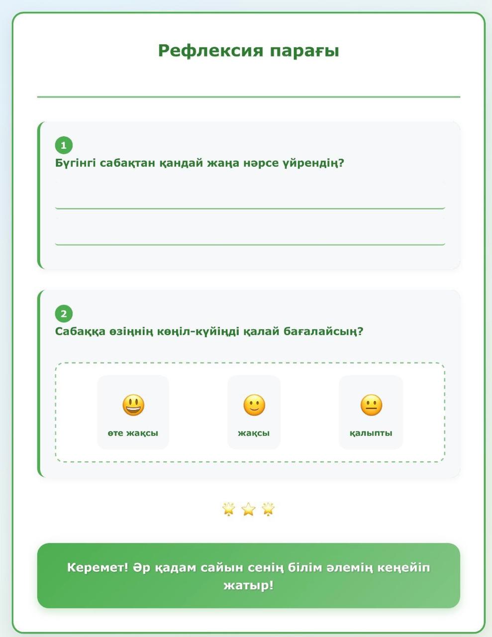 Сабақты бекіту тапсырмасы Шарты: платформада берілген тапсырманы орындап бүгінгі тақырыпты қорытындылайды Рефлексия