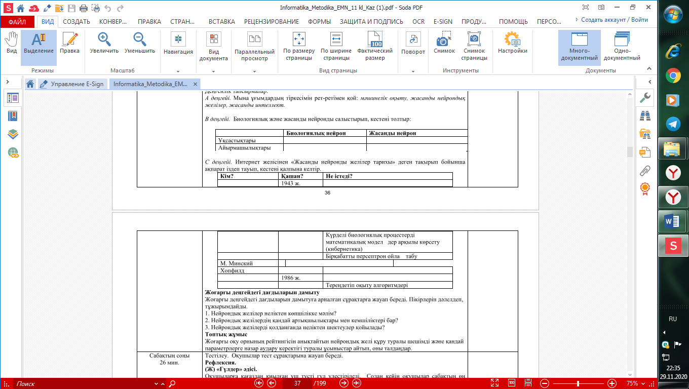 Кумулятивтік әңгіме «Мәшинелік оқыту» деген не? Мәшинелік оқытуға қандай мысалдар келтіре аласыңдар? Білім беру саласында ЖИ-ді қолданудың қандай үлгілері бар? «Джигсо» әдісі Әр топқа мынадай тапсырма беріледі: шағын мәтінді оқуға, оны қалай, қандай тәсілдермен есте сақтап, мазмұндауға болатынын ойлану, мәтіннің мәнін түсінуге бағытталған сұрақтар қою. Оқушылар тірек сөздерді жазып, сызба немесе кластер сыза алады. Мәтінмен жұмыс істеп болғаннан кейін топтар әр үш топтан 1-2 өкілден кірген тағы бір топ құрады. Мұғалімнің айтуымен олар жазбаны және графикалық материалды қолданып, өз сұрақтарын кезекпен түсіндіреді. Топтағы үш шағын мәтінді түсіндіріп, талқылағаннан кейін бәрі өз орындарына оралып, үш шағын тақырыптан (Есептеу жүйелері ұғымы. Есептеудің позициялық жүйелері. Есептеудің позициялық емес жүйелері) тұратын ортақ тақырыпты талқылайды. Мұғалім тарапынан бағалау: ауызша мақтау, ынталандыру. Жұптық жұмыс: №1 тапсырма: Анықтамада қалып қойған сөзді жаз. __________ - бір нейронның шығып, екінші нейронға кірген кезде соқтығысып, дабылдың қатты немесе әлсіз дабыл беруі. Білу және түсіну 1. Нейрондық желі деген не? 2. Нейрондық желілердің негізгі компоненттерін ата. 3. Нейрондық желілерді қолдану мысалын келтір. Қолдану Деңгейлік тапсырмалар: А деңгейі. Мына ұғымдардың тіркесімін рет-ретімен қой: мәшинелік оқыту, жасанды нейрондық желілер, жасанды интеллект.