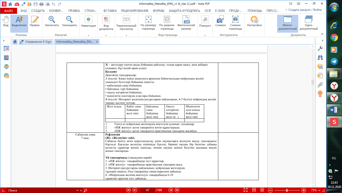 Барлық кіріс элементтері тікелей шығыс элементтерімен біріккен желі бірқабатты нейрондық желі немесе персептрон желі деп аталатындығы түсіндіріледі. Бірқабатты нейрондық желіні қарастырайық (1-сурет). Әрбір элемент көптеген Х кірістен жеке салмақпен әрбір нейронмен біріктірілген. Ал әрбір нейрон өлшенген кіру санын көрсетеді. Бірқабатты желілердің құрылымының күрделілігі жасырын нейрон қабаттарының жоқтығынан өзгере қоймайды. Оқулықтағы суретті қолданып, бірқабатты нейрондық желі жайлы толық түсіндіріледі. o Осыдан кейін көпқабатты нейрондық желі түсіндіріледі. Оқулықтағы сурет қолданылады. Көпқабатты нейрондық желі – кіріс және шығыстан тұратын және олардың арасындағы бір (бірнеше) жасырын нейрон қабаттарынан тұратын нейрондық желі. o Кері байланысы жоқ желілердің қандай топтарға бөлінетіні айтылады. Жұптық жұмыс: №1 тапсырма: Кері байланыссыз желі дегеніміз не? o Барлық қабаты иерархиялық байланысқан желі. o Нейронның шығуынан алдыңғы қабаттағы бірдей нейронның немесе сол нейронның кірістеріне өтетін синаптикалық байланыстары жоқ желі. o Сиаптикалық байланыстары бар желі. o Бір қабаттан тұратын желі. o Кіріс элементтерінің барлығы шығыс элементтерімен байланысқан желі. o Нейронның шығуы қайтадан кіріске берілетін желі. Білу және түсіну Оқушылар НМШЖ әдісін қолданып, оқулықтың мәтінін оқып шығады. Н – негізгі ойлар (мәтінді оқып, сұраққа жауап беру, мәтіннің негізгі ойын анықтау). М – мұқият оқу (қайтадан мұқият оқып шығу, толық ақпараттың негізгі оймен үйлесуі). Ш – шолу жасау (бар біліммен қатар салыстыра байланыстыру). Ж – жетілдіру (мәтін жады бойынша қайталау, толық қарап шығу, нені жіберіп алдыңыз, бұл қалай орын алды). Қолдану Деңгейлік тапсырмалар: А деңгейі. Көңіл күйді анықтауға арналған бейнетаспадан нейрондық желіні төмендегі белгілері бойынша сипатта: • қабатының саны бойынша; • байланыс түрі бойынша; • оқыту алгоритмі бойынша; • шешілетін есептердің кластары бойынша. В деңгейі. Интернет желісінің ресурстарын пайдаланып, 4-5 белгілі нейрондық желіні таңдап, кестені толтыр.