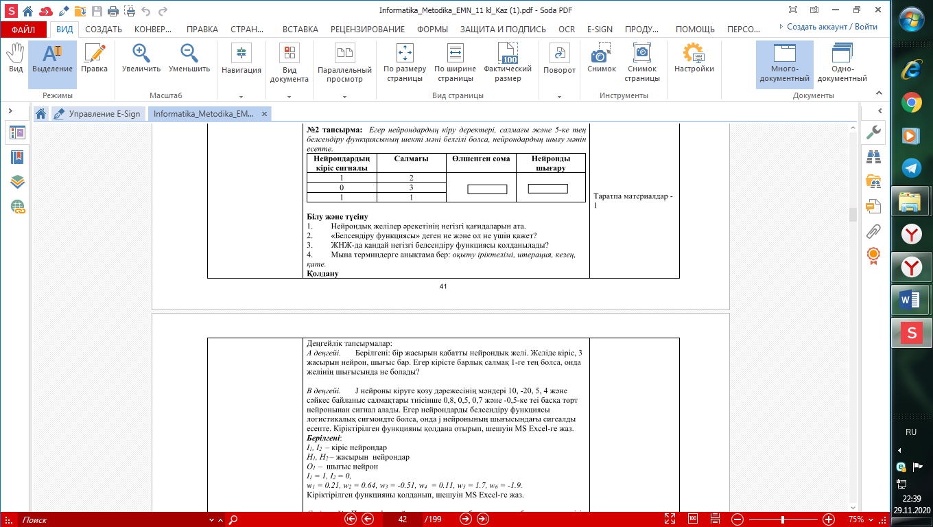 Оқулықтағы материалды өз бетінше оқу. «Тыңдаушы үштік» әдісі Топтық жұмыс Оқушылар үштен топ болып отырады, соның ішінде екеуі бір-біріне қарама- қарсы отырады да, үшіншісі алыстау жерде отырады, ол қатыспайды, бірақ бақылап отырады. Бұл қалай жұмыс істейді: Оқушылар үш топта жұмыс істейді. Әр оқушы сөйлеуші, сұрақ қоятын және жазатын рөл атқарады. Сөйлеуші бір мәселені түсіндіреді немесе оған түсінік береді немесе пікір білдіреді. Сұрақ қоятын адам түсініктеме беруді өтінеді. Жазатын адам ескертпе жасайды да, әңгіменің соңында нәтиже береді. Келесі жолы рөлдер өзгереді. Жұптық жұмыс: №1 тапсырма: Анықтамада қалып қойған сөздержді жаз. _______________ - кіріс сигналдарының олардың сәйкес салмақтарына көбейтілген қосындысы. _______________ - өлшенген соманың нәтижесіне байланысты нейронныі кірісі тек 1 немесе о болатын белсендіру функциясының түрі. _______________ - нейрондық желінің оқытуға арналған деректер жиынтығы. №2 тапсырма: Егер нейрондардың кіру деректері, салмағы және 5-ке тең белсендіру функциясының шекті мәні белгілі болса, нейрондардың шығу мәнін есепте.