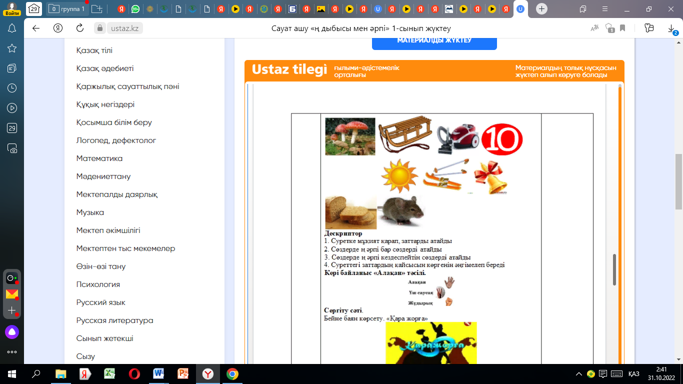 сөздерді буындап, қосып оқиды әріптің, әріптердің өзара байланыс элементтерін жазады берілген сөйлемдердің ретін анықтайды, мәтін құрастырады |