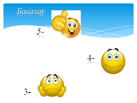 Бағалау-оқушы білімін тексеруді қалай жоспарлайсыз? Оқушылар бірін-бірі өзара бағалау және мұғалімнің жетекшілік етуі арқылы бағаланды. «Бас бармақ», смайликтер, қол шапалақтау, «Бағдаршам», жалаушалар. |