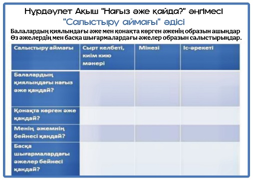 -Нұрдаулет Ақыштың «Нағыз әже қайда?» әңгімесіндегі кейіпкерлердің портретін іс-әрекеті арқылы ашады; -Нұрдаулет Ақыштың «Нағыз әже қайда?» әңгімесіндегі кейіпкерлерді шынайы өмірмен байланыстырады; -Нұрдаулет Ақыштың «Нағыз әже қайда?» әңгімесіндегі кейіпкерлерді шынайы өмірмен байланыстырып, салыстыра алады. |