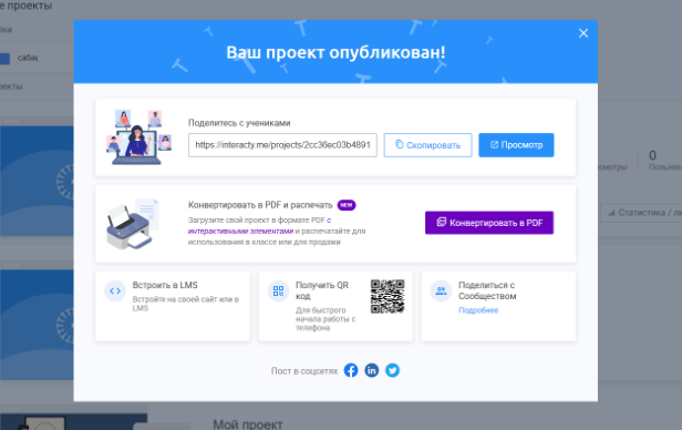 2. Сілтемені көшіру арқылы оқушылармен бөлісуге немесе QR-код жасап таратуға
