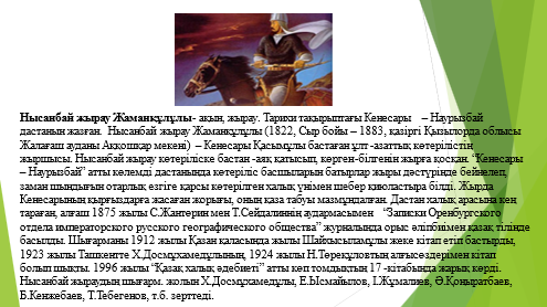 1-топ Кенесары батыр мен Наурызбай батырдың тарихтағы рөлін көрсет. Нысанбай жырау Жаманқұлұлы - ақын, жырау. Тарихи тақырыптағы Кенесары – Наурызбай дастанын жазған. Нысанбай жырау Жаманқұлұлы– Кенесары Қасымұлы бастаған ұлт-азаттық көтерілістің жыршысы. Нысанбай жырау көтеріліске бастан-аяқ қатысып, көрген-білгенін жырға қосқан. 2-топ.Нысанбай жыраудың шығармашылық жолын кімдер зерттеді? Нысанбай жыраудың шығарм. жолын Х.Досмұхамедұлы, Е.Ысмайылов, І.Жұмалиев, Ә.Қоңыратбаев, Б.Кенжебаев, Т.Тебегенов, т.б. зерттеді. 3-топ Жырау шығармашылығы туралы баяндау.“Кенесары – Наурызбай” атты көлемді дастанында көтеріліс басшыларын батырлар жыры дәстүрінде бейнелеп, заман шындығын отарлық езгіге қарсы көтерілген халық үнімен шебер қиюластыра білді. 2-тапсырма.«Қай топ көп біледі» «Ойлан-жұптас-бөліс» әдісі. Нысанбай жыраудың «Кенесары Наурызбай»жырының тақырыбы мен идеясы туралы ой бөлісу. “Кенесары – Наурызбай” атты көлемді дастанында көтеріліс басшыларын батырлар жыры дәстүрінде бейнелеп, заман шындығын отарлық езгіге қарсы көтерілген халық үнімен шебер қиюластыра білді. Жырда Кенесарының қырғыздарға жасаған жорығы, оның қаза табуы мазмұндалған. 3-тапсырма.Топтық жұмыс «Зерттеушілік конференциясы» әдісі 1-топ «Кенесары – Наурызбай» жыры неліктен тарихи жырға жатады? Дастанның тарихи негізі туралы қандай дәлелді пікірлер айтар едіңдер? 2-топ Шығарма неге «Кенесары – Наурызбай» деп аталған? Сендер қандай атау ұсынар едіңдер? 3-топ Осы дастанды жырлаудағы ақынның басты мақсаты не деп ойлайсыңдар? “Кенесары – Наурызбай” атты көлемді дастанында көтеріліс басшыларын батырлар жыры дәстүрінде бейнелеп, заман шындығын отарлық езгіге қарсы көтерілген халық үнімен шебер қиюластыра білді. Жырда Кенесарының қырғыздарға жасаған жорығы, оның қаза табуы мазмұндалған. Үй тапсырмасы: «Кенесары Наурызбай» жырын оқып, әдеби талдау жасайды. |