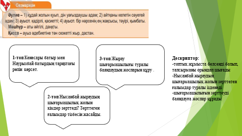 Дескриптор: -топтық жұмыста белсенді болады - жырау-дың шығармашылық жолын зерттеген ғалымдар туралы ізденеді - жоспар құрады - постер құрып қорғайды -кітапта берілген мәліметтерді мұқият оқиды -сұрақ-тарға өз пікірлерін, ойларын нақ айтып жеткізеді -шығар-маның тақырыбы мен идеясын ашады |
