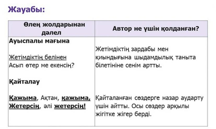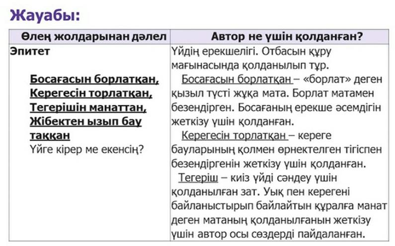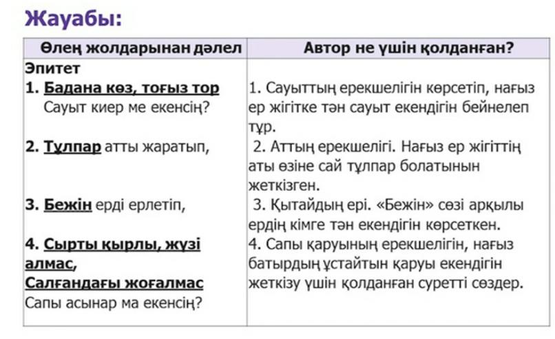 -шығармадағы тілдік бейнелеу, суреттеу құралдарының (теңеу, эпитет, ауыспалы мағынадағы сөздер, қайталау, өлең құрылысы) мағынасын анықтайды; -көркем шығармадан алған әсерін сипаттап авторға хат, өлең жазады |