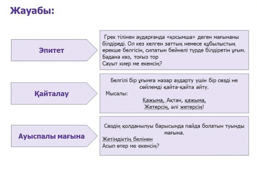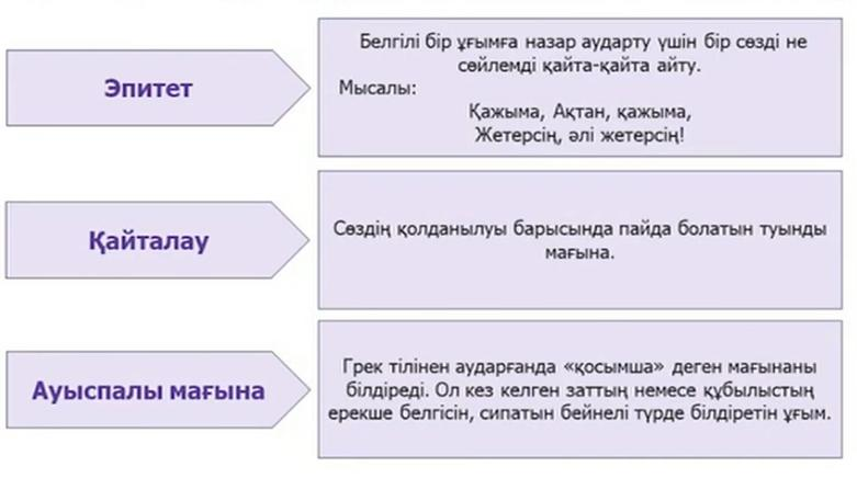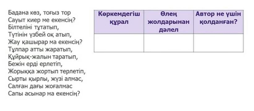 Көркемдегіш құралдарының анықтамасын сәйкестендір Өлеңді мәнерлеп оқып, эпитеттерді табады. Автордың көркемдегіш құралдарды қолданудағы мақсатын түсіндір Өлеңді мәнерлеп оқып, көркемдегіш құралдарын (ауыспалы мағына, қайталау) табады. Автордың көркемдегіш құралдарды қолданудағы мақсатын түсіндіреді. Хат құрылымын сақтай отырып, өлеңнен алған әсерлеріңді жазады |