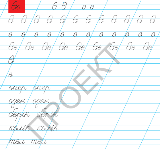 Ө әрпінің жазылу емлесін түсініп қарайды. Дәптерге әріптің емлесін сақтай отырып, ө әрпінің үлкен және кіші әріптерін жазады. Бірінші сөйлемді бір оқушы бастап оқиды.Екінші сөйлемге екі оқушы қосылады.Үшінші сөйлемге барлық оқушылар қатысып мәтінді мәнерлеп оқып шығады.