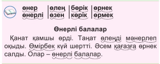 Жетістік критерийі: Сөз, сөйлем, мәтінді тексеру, қатені түзетеді Дескриптор: - жазу жолын, жол аралық кеңістікті, жолдың жоғары және төменгі сызығын сақтайды - әріптердің өзара байланыс элементтерін жазады. Тиісті түспен бояп, буынға бөледі |