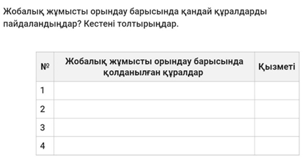 Сабақты бекіту. Жобалық жұмысты орындау барысында қандай құралдарды пайдаландыңдар? Кестені толтырыңдар.