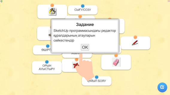 Мұғаліммен амандасады. Оқушылар жұбымен жағымды пікірмен алмасады. Сұрақтарға жауап береді LearningApps платформасында әзірленген тапсырманы орындау. SketchUp программасының стандартты құралдарының атауын жазып жауабымен тексереді. |