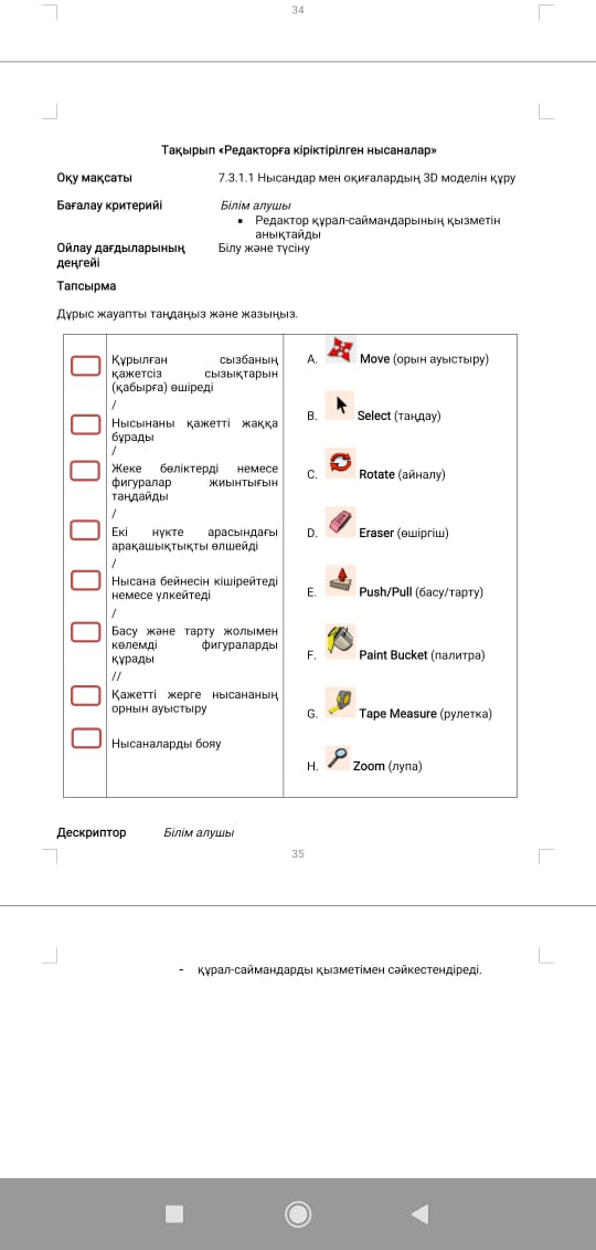 Мадақтау Қалыптастырушы бағалау Мұғалім оқушыларды сабаққа қатысу белсенділігі мен сұраққа жауап беру деңгейіне қарай «Қошеметтеу» әдісі арқылы бағалайды. Оқушылар сабақ бойы пирамидаға өз әрекеттерін жазып отырады. Дискриптор: Құрал саймандарды қызметімен сәйкестендіреді 1балл |