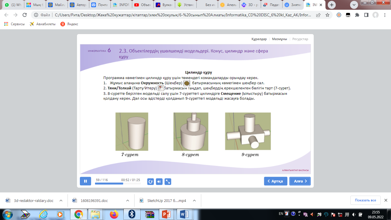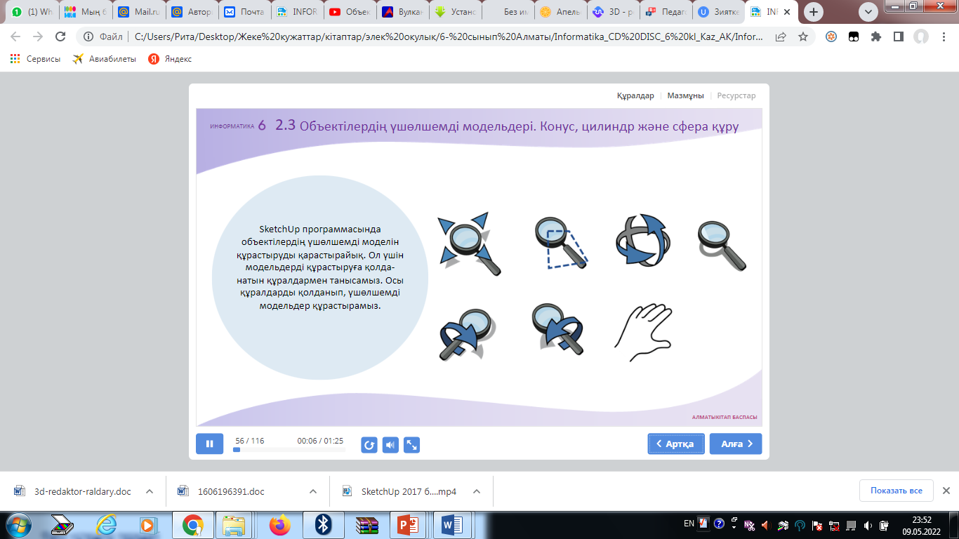 SketchUp программасының құралда-рын пайдалана алады. SketchUp программасында объектілердің үшөлшемді моделін құрастыруды біледі SketchUp программасының құралдарын пайдаланып, конус, цилиндр, сфера моделін құрастырады SketchUp программасының құралдарын пайдаланып, конус, цилиндр, сфера моделін біріктіру арқылы күрделі нысанның модельін құрастырады Word Wall тапсырмалары, Ұшаққа билет, Кинометафора, Миға шабуыл |