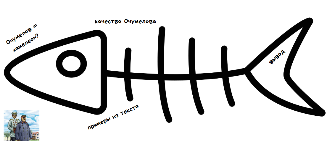 Хамелеон – в словарях у этого слова есть два объяснения, одно из них говорит о том, что это разновидность ящериц, меняющих свой цвет в зависимости от обстановки, второе значение формулируется так: “переносное значение. Беспринципный человек, легко меняющий свои взгляды в зависимости от обстановки”. Имя героя рассказа давно стало нарицательным, понятие “хамелеонство” вошло в русский язык. Хамелеоном мы обычно называем человека, готового постоянно и моментально, в угоду обстоятельствам менять свои взгляды на противоположные. 1.Сколько раз и почему меняет своё решение Очумелов и как это проявлялось внешне? Есть ли в рассказе герои, которых автор упоминает, но они не появляются перед читателями? Их роль в повествовании. Стратегия «Синквейн». Предлагает подобрать подходящие слова, опираясь на сюжет рассказа Чехова. Составить синквейн на тему «Очумелов» Пример синквейна: Очумелов Строгий, меняющийся Выясняет, снимает, надевает Я ещё доберусь до тебя! Хамелеон 1. Подумать над вопросом: Почему полицейского надзирателя Очумелова можно назвать хамелеоном? Заполни схему “фишбоун”