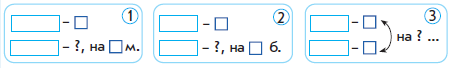 3.Постановка цели (проблемная ситуация). Вводное задание на подготовку к изучению нового. (И) Самостоятельная работа. Подбери схемы краткой записи к этим задачам и реши. а) Стояло 7 рюкзаков и 5 чемоданов. На сколько рюкзаков больше, чем чемоданов? б) Стояло 7 рюкзаков, а чемоданов – на 2 меньше. Сколько стояло чемоданов? в) Стояло 5 чемоданов, а рюкзаков – на 2 больше. Сколько стояло рюкзаков?
