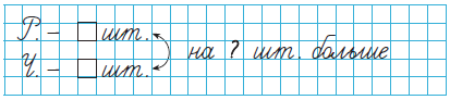 Посчитай рюкзаки и чемоданы. На сколько рюкзаков больше, чем чемоданов? На сколько чемоданов меньше, чем рюкзаков? Составь и реши задачу. Записать задачу можно так: