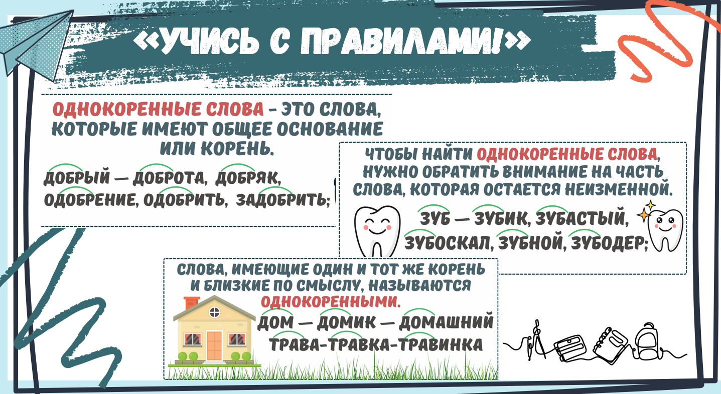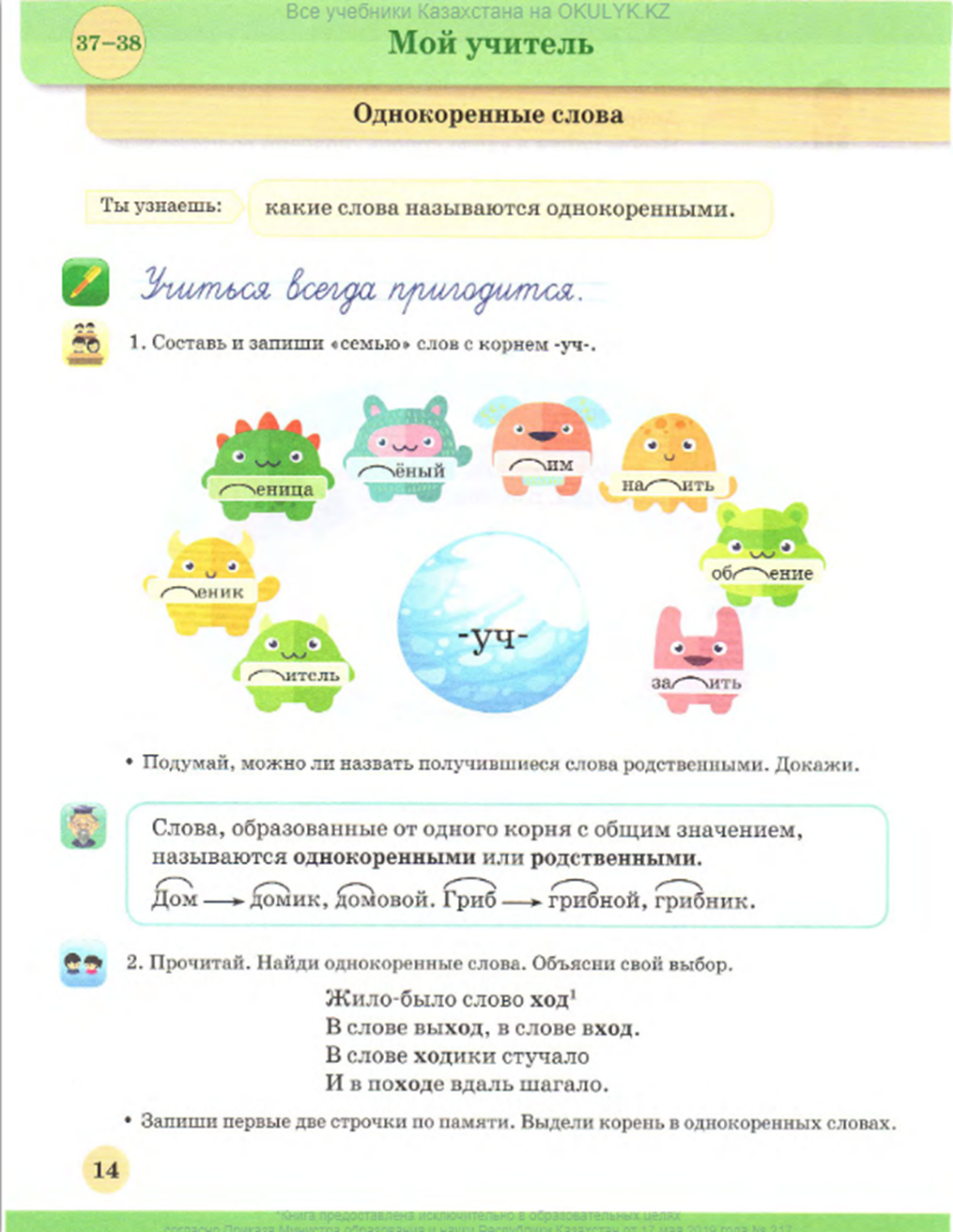 2.1.4.1 участвовать в диалоге, высказывая свое мнение и выслушивая мнения других 2.2.5.1 находить информацию по двум источникам (словари, справочники, детские энциклопедии, детские познавательные журналы) на определенную тему 2.3.8.2 определять значимые части слова, выделять корень в слове и подбирать однокоренные слова |