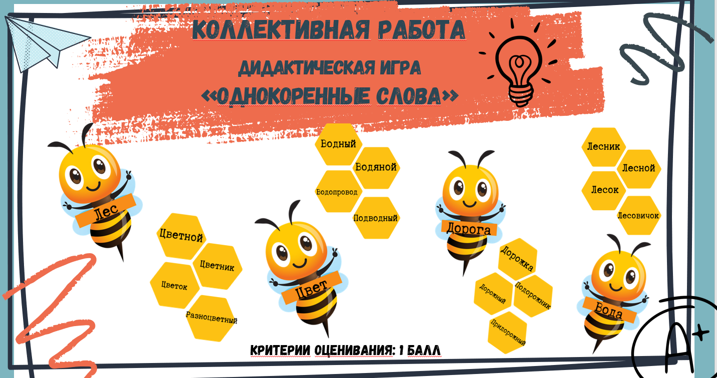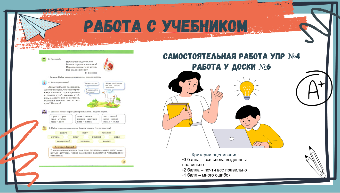 Дескриптор: Вспоминают, что знают о родственных словах Участвуют в интерактивной игре (отвечают на вопросы, делятся мыслями) Дескриптор: Слушают объяснение учителя Собирают «листочки» со словами и прикрепляют к своему дереву Делают вывод, что тема урока — «однокоренные слова» Дескриптор: Смотрят видео Формулируют тему и цель урока Дескриптор: Работают с правилом в учебнике Дескриптор: читают пословицу Объясняют значение непонятных слов Обсуждают общий смысл и чему учит пословица Дескриптор: Открывают учебник Читают задание Выполняют упражнения по учебнику Дескриптор: Подбирают однокоренные слова к данным словам Обсуждают, как они показывают богатство и единство народа Дескриптор: Играют в игру у доски Закрепляют знания по теме при помощи работы в группе Дескриптор: Находят однокоренные слова Дескриптор: Читают задания на новой странице Выполняют упражнения по учебнику Повторяют движения за учителем Дескриптор: Работа в группе Дескриптор: Выполняют самостоятельную работу по рабочим листам