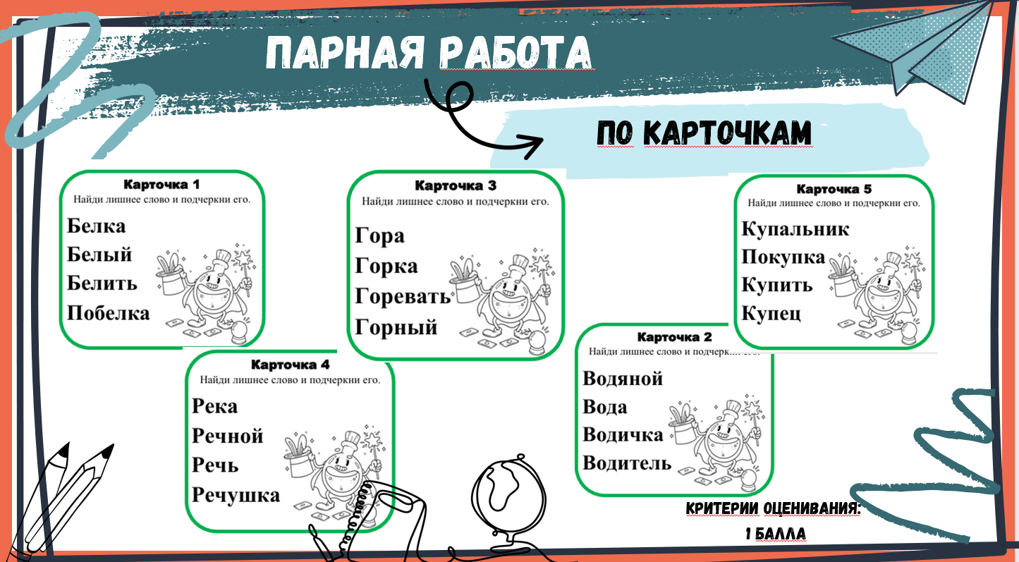 "Молодцы! Вы отлично справились с самостоятельной работой. А теперь поработаем в парах. Обсудите со своим напарником задание и вместе найдите правильные ответы. Важно послушать друга и приходить к общему". Задание: Найди лишнее слова и подчеркни его