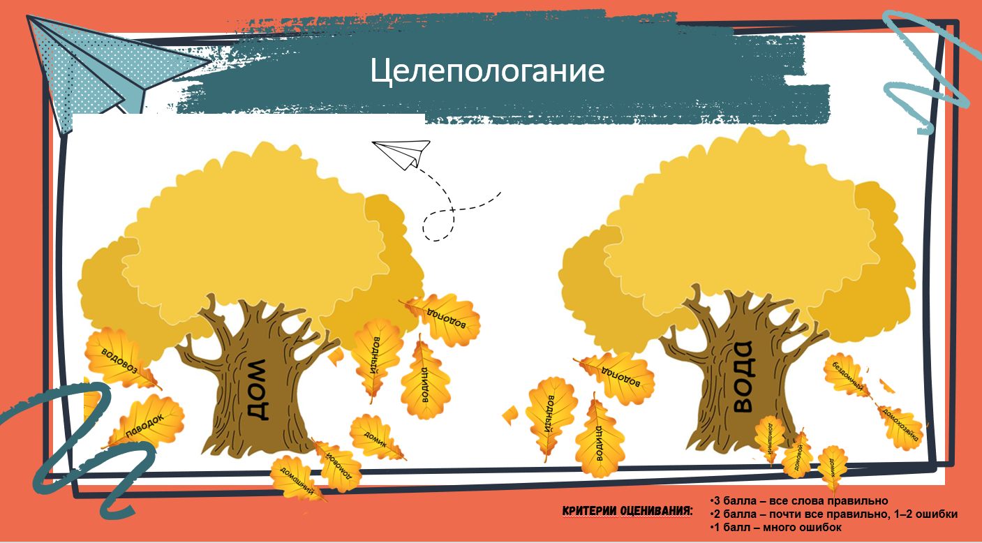 Целеполагание. «Ребята, а теперь мы переходим к дидактической игре. Перед вами два дерева. У каждого дерева должны быть свои листочки. Но это не простые листочки, а листочки со словами. Наша задача — собрать только родственные слова и прикрепить их к своему дереву! Через эту игру мы узнаем и закрепим, как находить однокоренные слова».