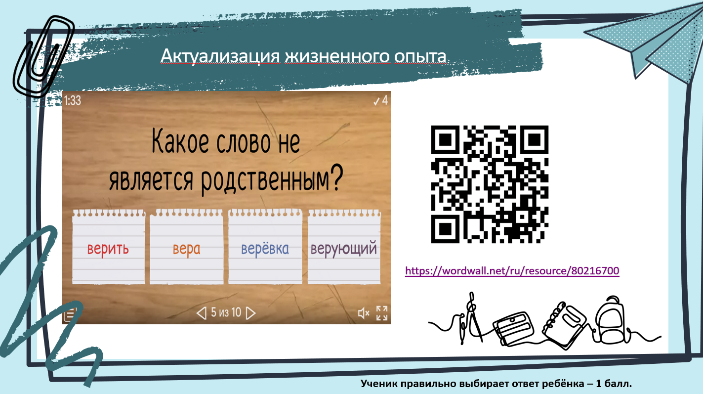Актуализация жизненного опыта. «Ребята, прежде чем приступить к изучению новой темы, давайте вспомним, что мы уже знаем о родственных словах. Для этого я предлагаю вам поиграть в интерактивную игру!