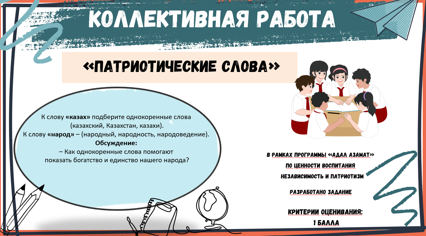 В рамках программы «Адал Азамат» по ценности воспитания независимость и патриотизм разработано задание: «Патриотические слова»