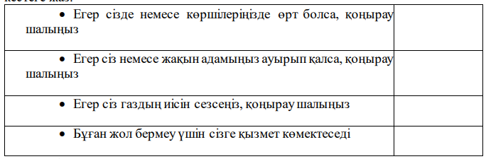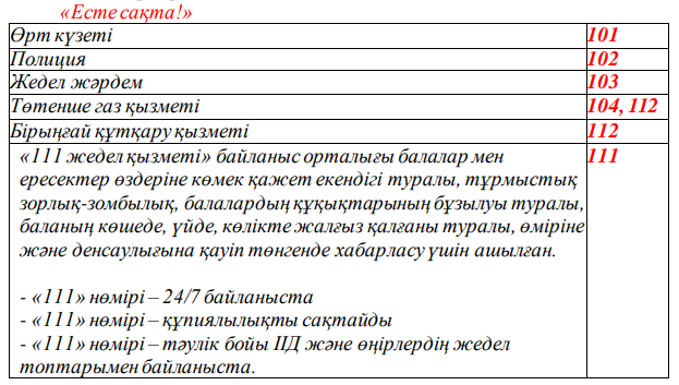 Бастапқы білімді игеружәне түсінуді тексеру Қауіпсіздік қызметтерін шақыру ережелері Педагог: қауіпсіздік менеджері қоңыраудың себебін тез түсініп алу үшіндұрыс хабарлап айту керек. Жедел қызметкеқоңыраушалған кезде диспетчерге нені хабарлаукерек: 1. Мекенжайды хабарлау керек. Себебі байланыс үзілсе де, құтқарушылар қайда бару керектігін біледі. 2. Бұл қайда болды: аулада, пәтерде, қоймада және т.б. 3. Не жағдай болды: өрт шықты, газдың иісін сездіңіз, төбеден су кетті және т.б. Диспетчерге үйдің, пәтердің нөмірін және аты-жөніңді, телефон нөміріңді хабарлау керек. МАҢЫЗДЫ! Төтенше қызметтерге жалған қоңырау шалуға, алдауға болмайды! Бекіту. Өзіндік жұмыс Тапсырма. Жағдайды анықтап, төтенше қызметтерінің телефон нөмірін кестеге жаз.