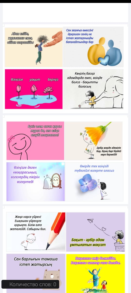 Психологиялық тренинг: «Жаңа тыныс» Керекті құралдар: түссіз пакеттер, фломастерлер. Мақсаты: Мұғалімдердің ішкі негатив эмоцияларын, психологиялық қысым мен күйзелісті жеңілдету; Жағымсыз ойлардан арылып, позитивті көңіл күй қалыптастыру; |