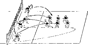 2. Сыныпты топтарға бөлу қажет. Оқушылар №6, 3 және 4 аймақтарына орналасад. Оқушылар допты №6 аймақтан №3 аймаққа, №3 аймақтан №4 аймаққа жалғайды, №4 аймақтағы ойыншы допты өзінің үстіне жоғары көтеріп №6 аймаққа жалғайды және т.с.с. Ойыншы допты жалғаған соң өзі шыққан лектің соңына барып тұрады. Дескриптор : - алға-жоғары серіктесіне тура береді. - одан бір шетке қарай береді - екі рет жалғаудан соң 1800 айналып орындайды. Бағалау: тапсырманы орындағаннан кейін мұғалім оқушыларға өзара бағалау жүргізуді ұсынады. Мұғалім сұрақ қояды: - доппен орындалатын жаттығулар сіздің ағзаңызға қалай әсер етеді? - Осы тапсырма қандай дене қасиеттерді дамытады? Мұғалім, оқушыларды дұрыс жолға бағыттайды және қандай да бір қиыншылықтар мен тіл проблемалары туралы ескертулер жазып алады (спорт терминологиясы және т.б.) Мұғалім кейде оқушыларға ынталандырушы сұрақтар қойып, олардың қаншалықты тапсырманы орындаумен айналысып отырғанын тексереді. Қажетті жағдайда мұғалім келіспеушілік жағдайында мәселені дұрыс шешуге талпынады. |