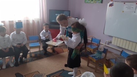 Педагог: Олай болса, бүгінгі оқу қызметін бастамас бұрын, мен сендерді үш топқа бөліп алғым келеді. Үшбұрыш тобы: Шаршы тобы: Дөңгелек тобы: Меің қолымдағы пішіндерді өздеріңе ұнағанын аламыз. -Балалар, бүгін белсене қатысқан балаға, мен балмұздақ беремін, ол балмұздақты соңында санаймыз, қай топ белсенді болғанын білеміз. Логикалық сұрақ: Шарты: Суретте 3-4 ойыншық суретін ретімен атап шығуы тиіс.