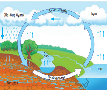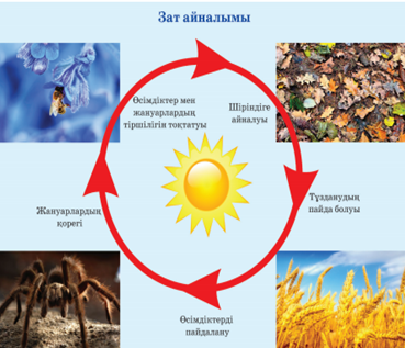 2.«Зат айналымы» сызбасына қарайды. Бұл сызбада Күн неге ортада орналасқанын түсіндіреді. Айналымның басын анықтайды. Осы айналымдағы заттар қозғалысының логикалық тізбегін құрады, оны дәптерге жазады. Зат айналымы немен тұйықталады?
