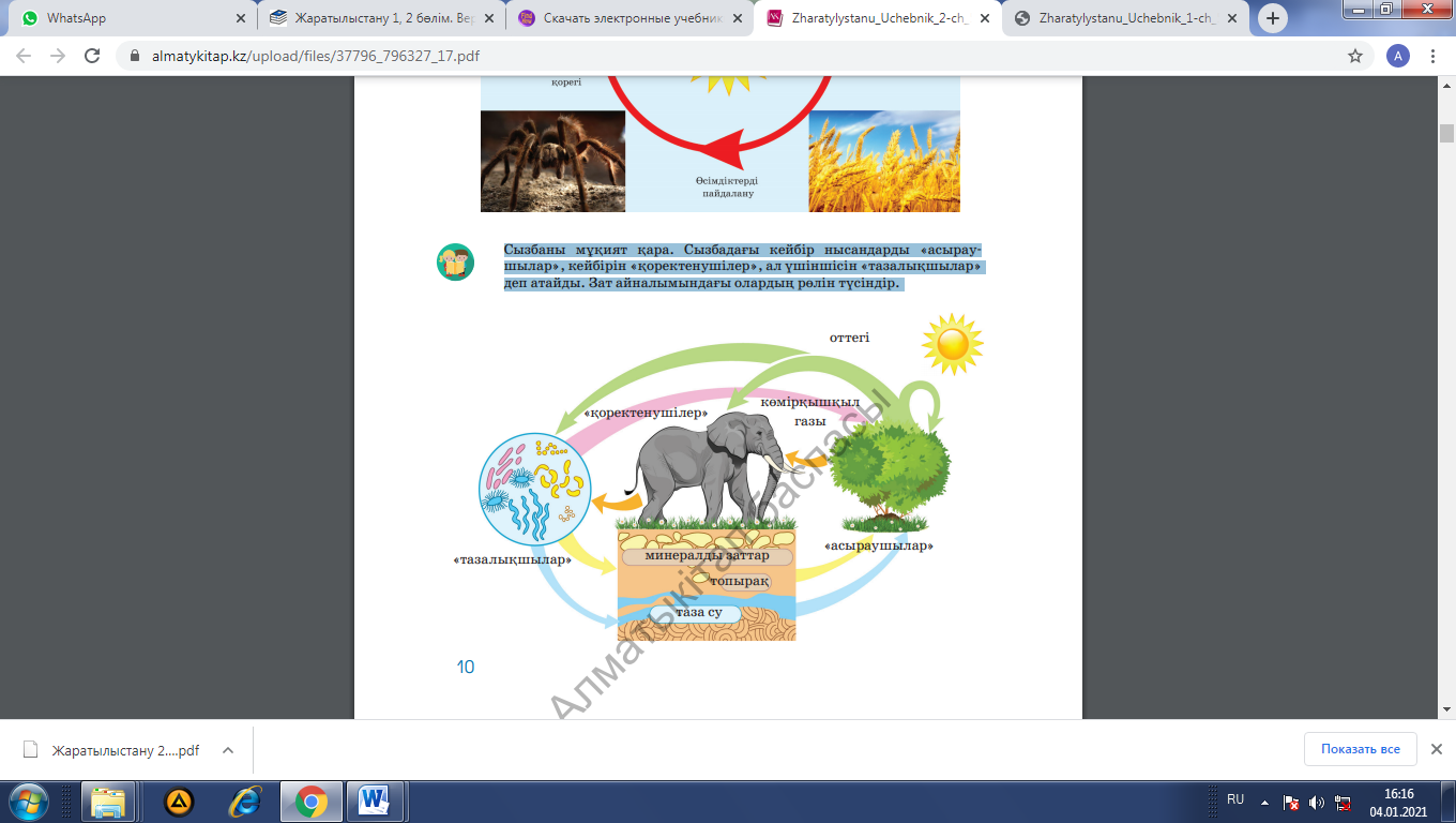 2. Тапсырма Сызбаны мұқият қарайды. Сызбадағы кейбір нысандарды «асыраушылар», кейбірін «қоректенушілер», ал үшіншісін «тазалықшылар» деп атайды. Зат айналымындағы олардың рөлін түсіндіреді.