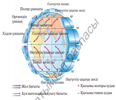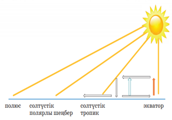 1.Тапсырма Параграфтың мәтінін және суретті пайдалана отырып, табиғаттағы ауа массасының айналуын сипаттайды. «Экватордан полюске дейін ауаның қозғалуы» сызбасын сызады: ауаның жылжуына әсер ететін түрткіжайттарды символдармен белгілейді.