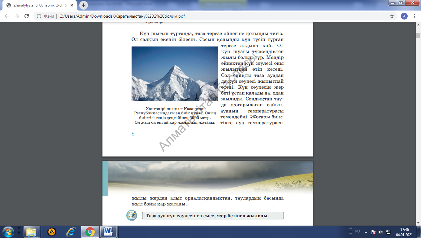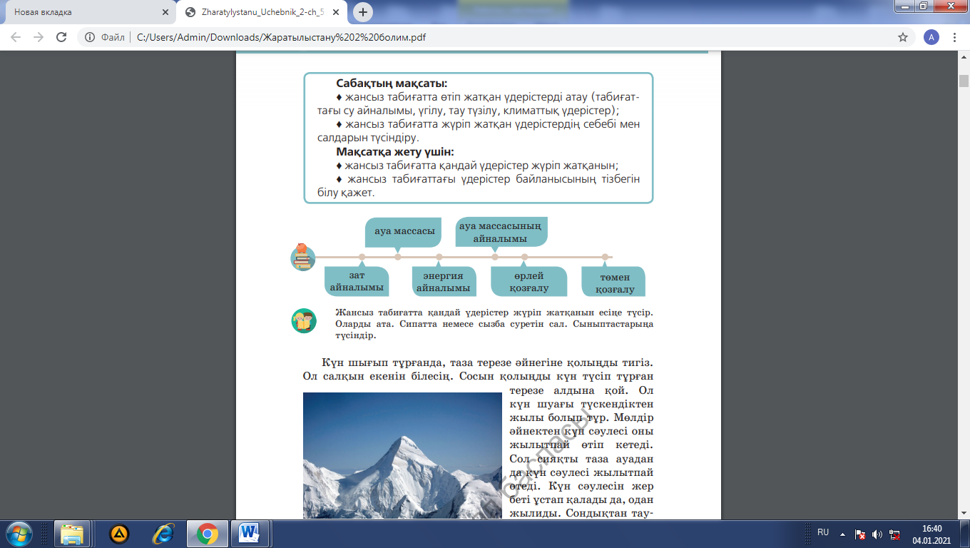 1.Тапсырма. Жансыз табиғатта қандай үдерістер жүріп жатқанын есіңе түсір. Оларды ата. Сипатта немесе сызба суретін сал. Сыныптастарыңа түсіндір.
