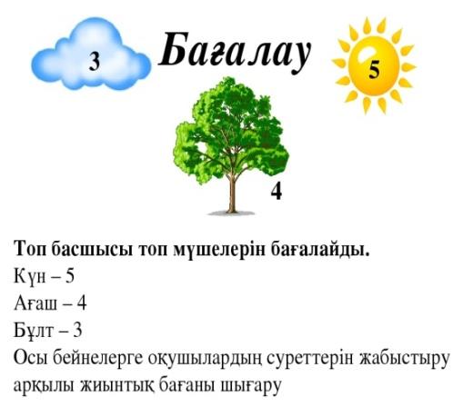 Дескриптор Білім алушы -сұрақтарға жауап береді, -мәтіннің мазмұнын талқылайды; -көтерілген мәселені анықтайды. Берілген бұлт, ағаш, күн суреттері арқылы бағалау
