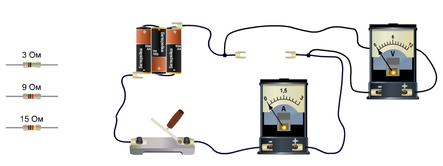 3 топ: Берілген тізбекті құрастырыңыздар: Ток күші мен кернеудің мәнін пайдалана отырып, кедергінің мәнін анықтаңыз: